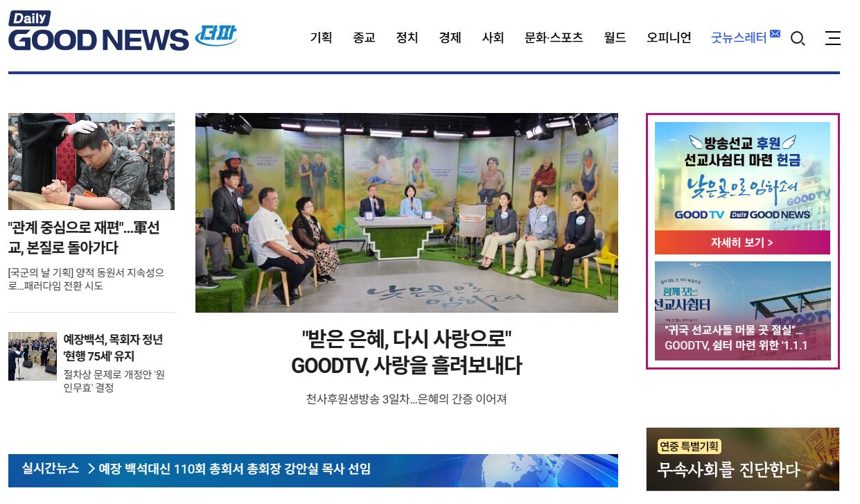 안녕하세요, 데일리굿뉴스입니다. 🍁 곧 민족 최대 명절인 추석 연휴가 시작됩니다. 올해는 개천절과 한글날까지 이어지는 황금연휴라 더욱 기대가 되는데요. 🌕 GOODTV는 연휴에 앞서 천사후원생방송 ‘낮은 곳으로 임하소서’를 은혜 가운데 마쳤습니다. 📺 이번 방송을 통해 선교사 쉼터 마련이라는 간절한 비전을 나누고, 성도님들의 따뜻한 관심과 사랑을 깊이 확인할 수 있었습니다. 🙏 이번 뉴스레터가 명절의 풍성한 기쁨과 하나님 나라를 향한 나눔의 은혜를 함께 나누는 통로가 되기를 소망합니다. |